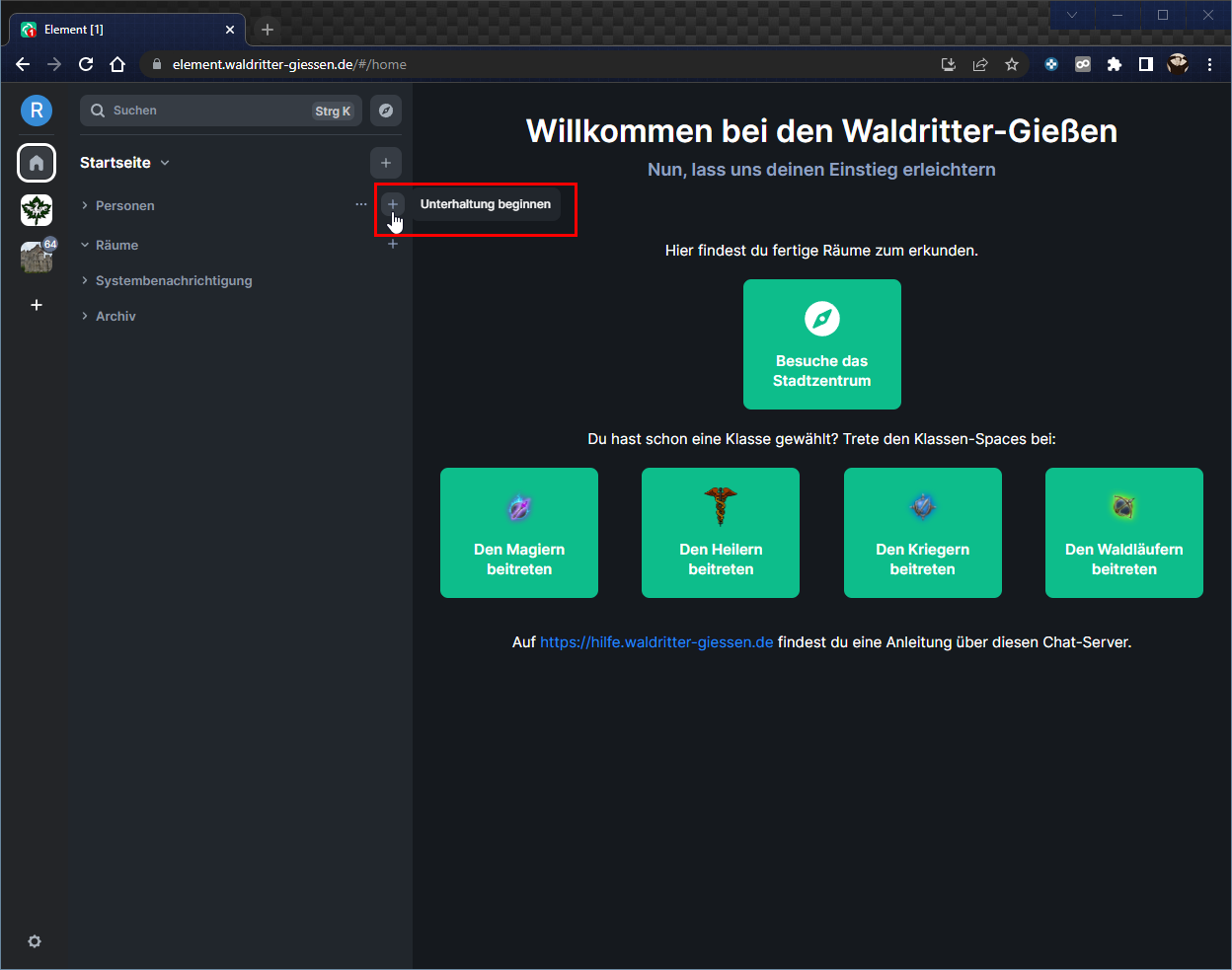 Um einzelne Personen anzuschreiben und somit einen 1:1 Chat zu erzeugen ist als Erstes auf das + in der Kategorie „Direkte Nachrichten“ zu klicken: